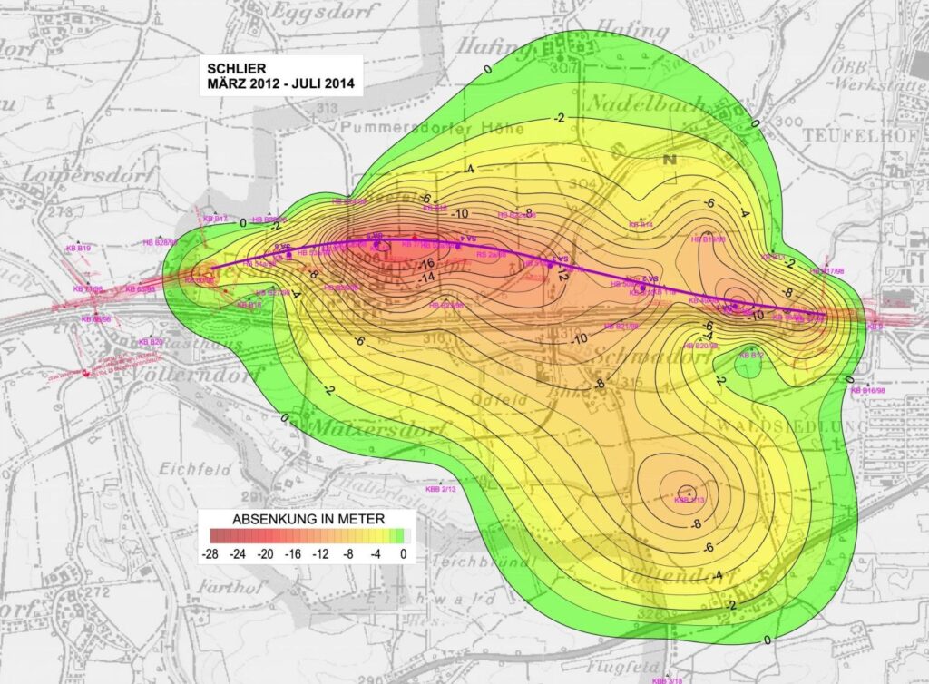 Differenzplan – Grundwasserdruckniveau (Bildzitat aus Präsentation Wasserverhältnisse im seichtliegenden Tunnel von M. Höllrigl, R. Hödl, 2014): Das Absenken des Grundwasserniveaus entlang der GZU hat weitreichende Auswirkungen auf den Grundwasserhaushalt. Bei der GZU ist es auf Planungsfehler zurückzuführen, wogegen bei der S34 das massenhafte Vergeuden des Grundwassers zur Untertunnelung des Hobbyflugplatzes in Völtendorf vorsätzlich und fix eingeplant ist. Laut Projektunterlagen der Asfinag werden dadurch etwa 25% des Trinkwasser-Bedarfs der Stadtbevölkerung verschwendet… und wenn sich die Planer wieder verrechnet haben, dann noch viel mehr.