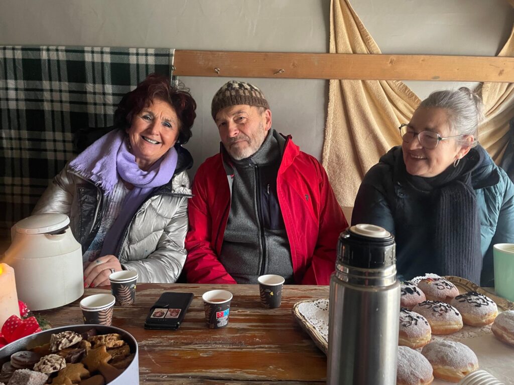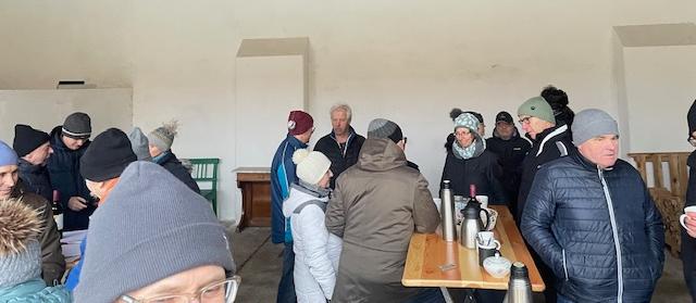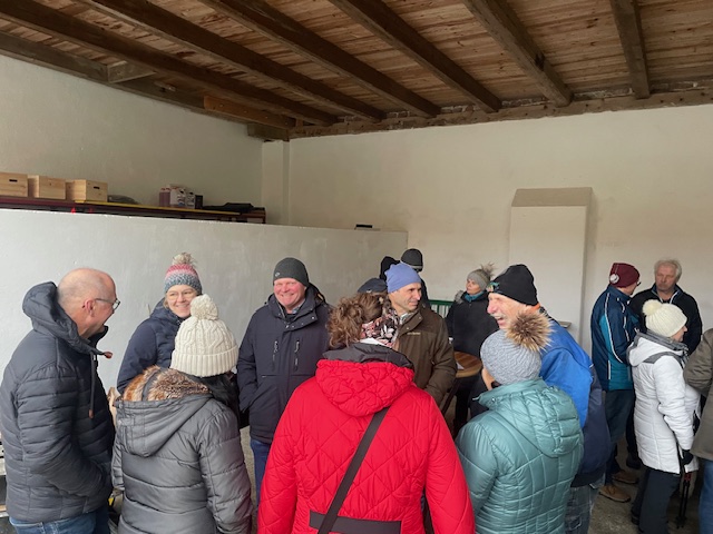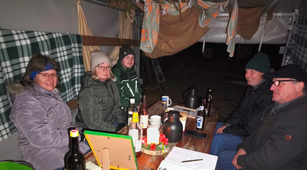 Den letzten Dialogabend am Protest-Podest lassen die Anwesenden gemütlich ausklingen. Hätten die Glocken vom Dorf herauf nicht laut und deutlich die Feierabendstunde geschlagen, hätten wir heute trotz frostiger Temperaturen glatt noch die Sperrstunde übersehen.