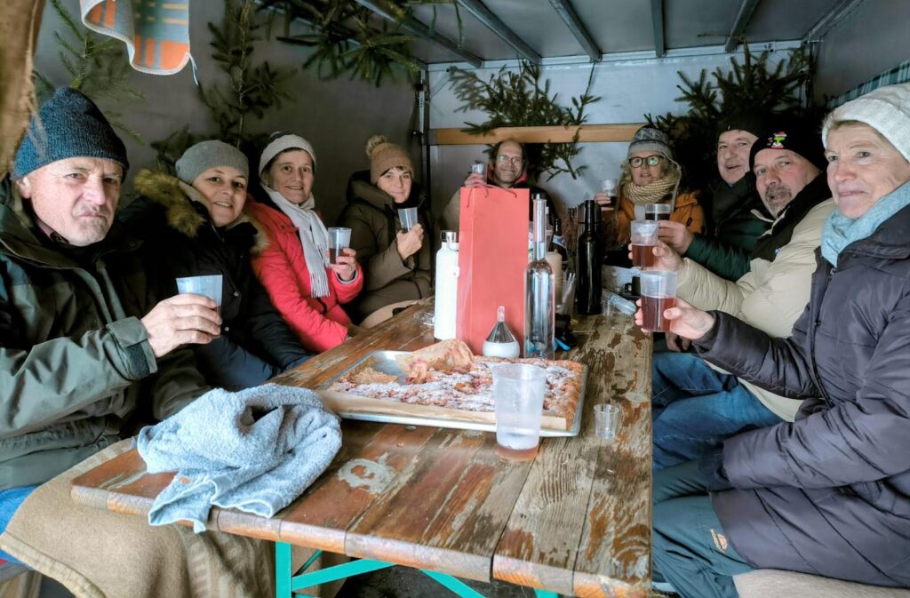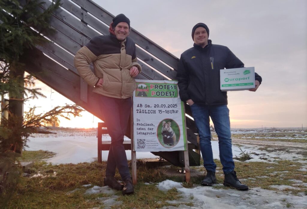 Ferdinand und Doris Kleemann, ihre beiden Jungs Lukas und Tobias sowie der Pudel Rocco sind am westlichen Ortsrand von Nadelbach zu Hause. Heute sind die Kleemanns unsere Gastgeber am Protest Podest. Doris versüßte den Gästen den eisig kalten Tag mit frisch gebackenem Eierlikörkuchen.