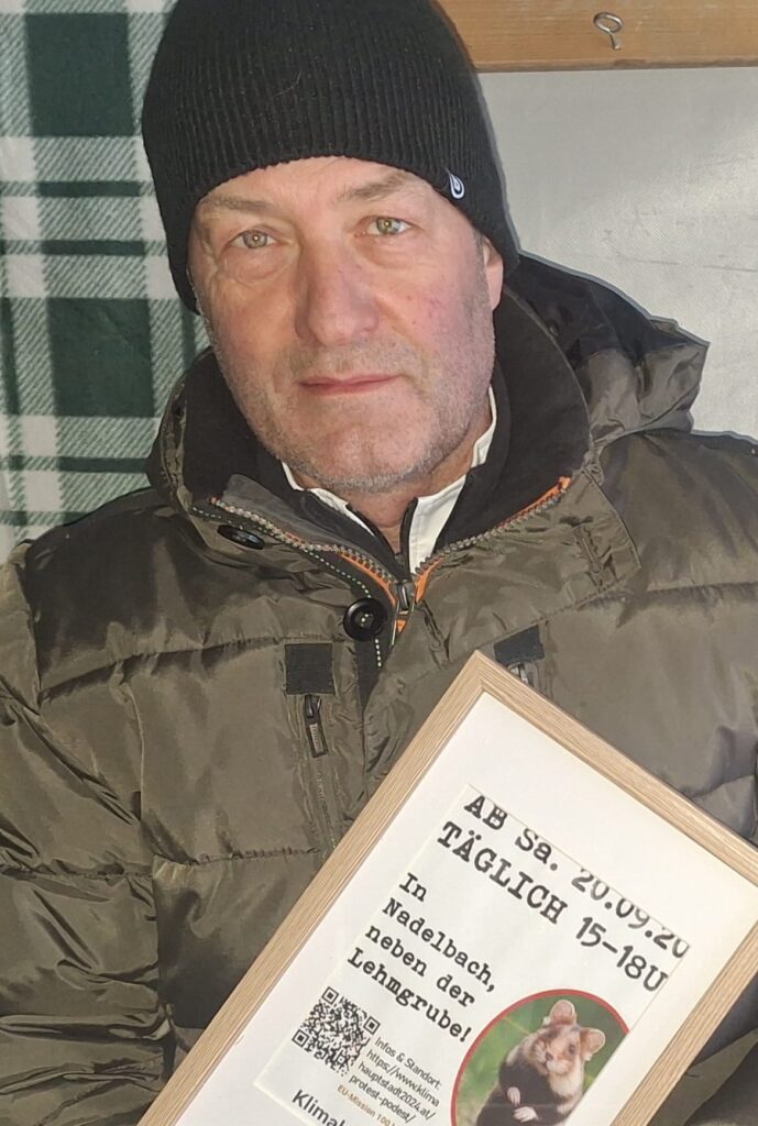 Von Anfang an war Karl im Hintergrund ganz vorne mit dabei, das Protest-Podest auf- und umzubauen, Tische, Bänke und Holzplatten bereitzustellen und am Camp mit Bio-Äpfeln aus frischer Ernte und köstlichen Säften vom Gunacker-Hof fürs leibliche Wohl zu sorgen.